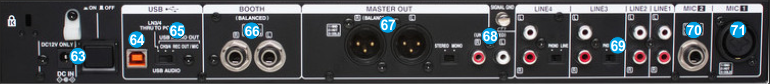 BOOTH OUTPUT (BALANCED): Use standard TRS cables to connect this output to a booth monitoring system. The level of this output is controlled by the Booth knob on the top panel.
