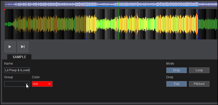 - GROUP & COLOR. Type a name to create a new Sample Group or add the sample to an existing one using the Drop down selection list. Click on the Color field to select the color that the Sample will have in the Pad View. If a sample is part of Group, the color selection will apply automatically to all the samples in that Group.