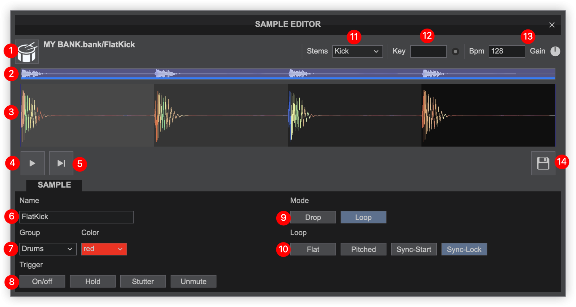 - WAVEFORM. Provides a visual display of the audio information and position of the sample as indicated by the playhead. It displays the beatgrid using the grayscaled background and can be zoomed in to make precise edits with a wheel mouse. A beat anchor (indicated in red) will display to the left of the waveform indicating the first detected beat of the sample.