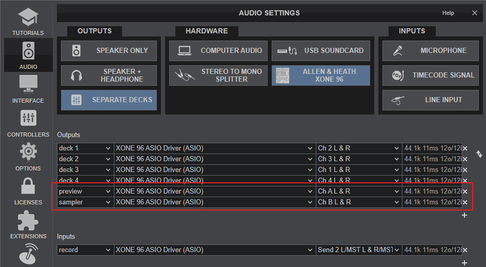 Select "sampler" , the Xone 96 sound card and Channels CH B L&R from the drop-down lists.