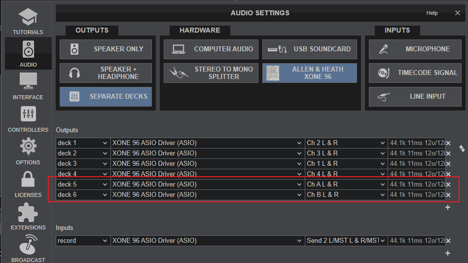 Below is an example of Audio Setup sending 6 Decks to Mixer Channels 1 to 4 and A to B.
