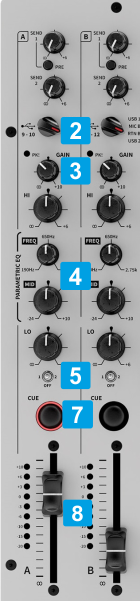 - CUE (PFL) (per channel) Press these buttons to send each channel to the Headphones Output channel. These buttons perform internal/hardware functionality. Even though these buttons send/receive MIDI, itis advised not to assign to a relative VDJ action, as there will be a conflict.