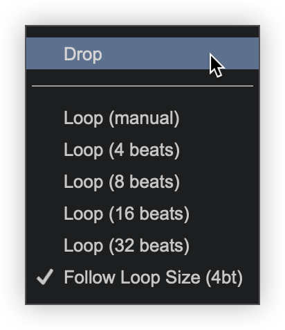 In the Record duration sub-menu, there are options to select drops, manual loops, and 4, 8, 16, or 32 beat automatic loops. There is also the option to Follow Loop Size which will use the loop size selected in the Loop Panel.
