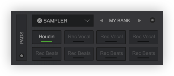 • With a deck loaded select any unlocked bank (like My Bank) from the Pad Bank parameter selection. Find the portion of the track to be recorded and click on the pad to record. The deck does not have to be playing to record a sample.