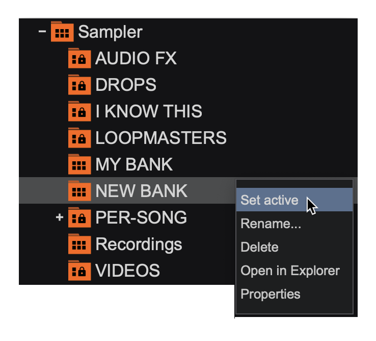 Right-clicking on the sample bank will give the options to Set active, Rename..., Delete, Open in Explorer, and Properties.