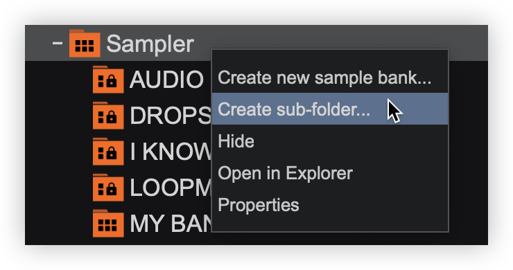 Right-clicking on the sub-folder will give the options to Create new sample bank..., Create sub-folder..., Rename..., Delete, Open in Explorer, and Properties. If creating a new sample bank or sub-folder it will be nested in the sub-folder it was created in.