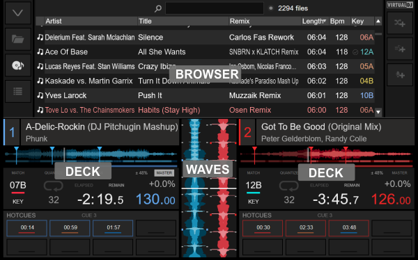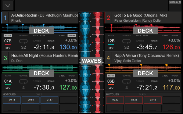 The Waves area will display the Vertical Scratch waves of the Left and Right assigned Deck. The waves can be hidden, locked (from accidental touch) or displayed in different colors and types, depending on the settings that can be found in the WAVES tab of SETTINGS view