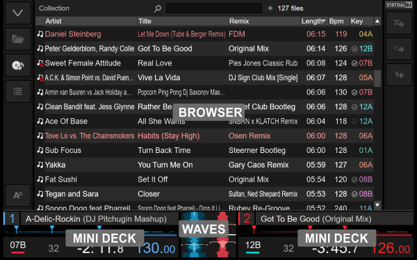 Use the VIEW button to toggle between the selected Decks view and the Large Browser view (with Mini Decks)
