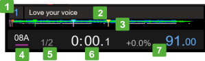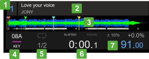 Denon Prime GO Screen - Pads view 1Deck number. 2Track's Title, Remix and Artist. 3Track's progress wave with Hotcues markers. Can be locked from Settings to prevent accidental taps4Track's musical key information. Key value can be displayed in Harmonic or Camelot view. Line is colored based on the key value. The MATCH text will be highlighted when Track's key matches the key of the other Deck.