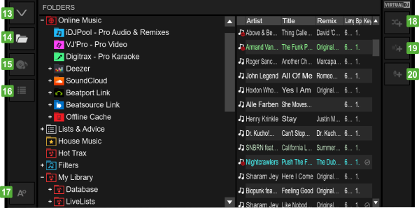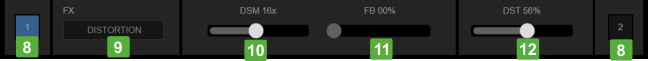 Tap this area to get more key controls at the Deck info area.5Current Loop size in beats. Quantize indicator/button 6Track's Times (Total, Elapsed/Remain). Tap the Elapsed/Remain Time area to toggle between the 2 views.7Track's Tempo information : Current BPM, Pitch, Pitch range%, Master Deck indicator.8Indicates the Decks that the selected Effect is assigned to9Displays the name of the selected Effect.10Displays the Parameter 2 value of the selected Effect.11Displays the Parameter 3 value of the selected Effect.12Displays the Parameter 1 value of the selected Effect.13Performance Pads. Displays the name of the currently selected Pads page, the values of its Parameters (if available) and information about the Pads functionality of the selected page.BROWSER