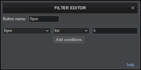 In this example the end goal is to have a quick filter that will display all tracks with multiple BPM ranges. So the field selected in the first box is BPM. In the second box list is selected. And finally in the 3rd box a range is added (5 in this case).