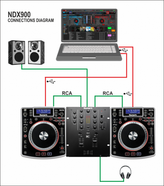 - Use a pair of RCA cables to connect each NDX Output to an Input Channel of a mixer. Any analogue or digital mixer can be used.