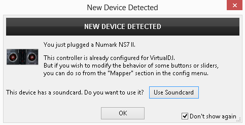 Click on the Use Soundcard in order VirtualDJ to apply the pre-defined audio setup with the built-in sound card of the NS7II (speakers need to be connected to the rear side of the unit in this case)