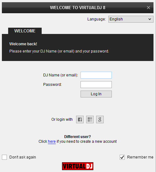 Once VirtualDJ 8 is opened, a Login Window will appear. Login with your Account credentials.