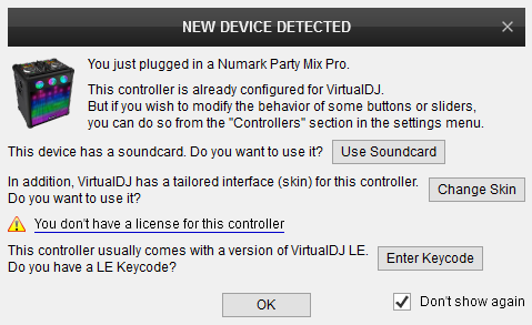 If VirtualDJ LE or the tailored Party Mix Pro skin are installed, an additional button Change Skin will be available to load the skin, or continue with the default skin of VirtualDJ 8.