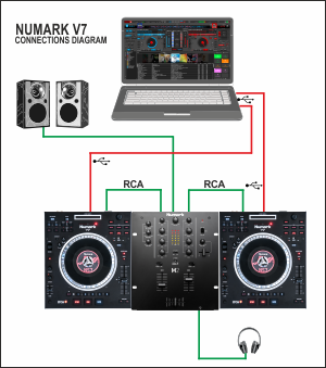 • Use a pair of RCA cables to connect each V7 Output to an Input Channel of a mixer. Any analogue or digital mixer can be used.