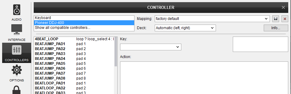 The unit should be visible in the CONTROLLERS tab of Config and the “factory default” available/selected from the Mappings drop-down list. The factory default Mapping offers the functions described in this Manual, however those can be adjusted to your needs via VDJ Script actions.