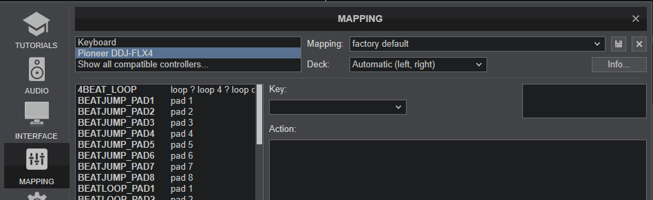 The unit should be visible in the MAPPING tab of Config and the “factory default” available/selected from the Mappings drop-down list. The factory default Mapping offers the functions described in this Manual, however those can be adjusted to your needs via VDJ Script actions.