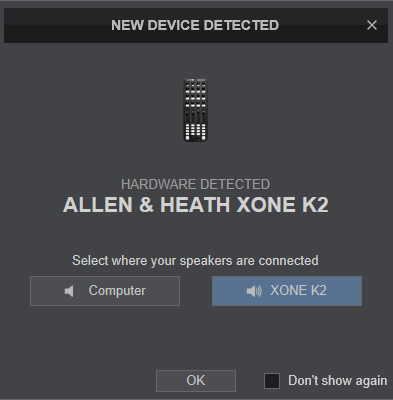 Note: The Detection window will not be offered if the Xone K2 is connected via X:LINK to a compatible Xone mixer.