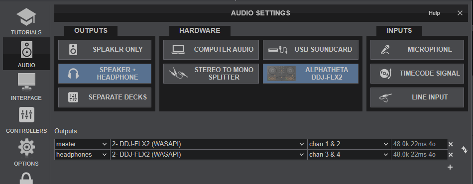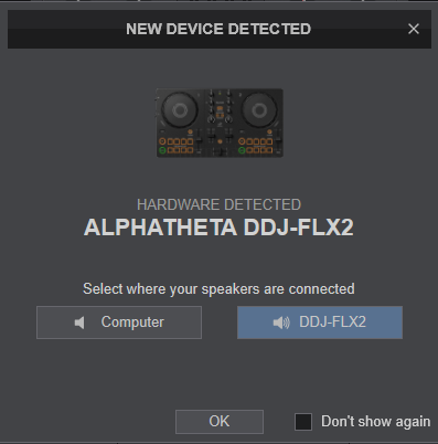 Click on the "DDJ-FLX2" button if speakers are connected to the Master Output of the DDJ-FLX2. You can still change that from Settings->AUDIO tab.