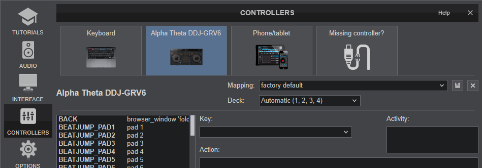 The device should be visible in the MAPPING tab of Config and the “factory default” available/selected from the Mappings drop-down list. The factory default Mapping offers the functions described in this Manual, however those can be adjusted to your needs via VDJ Script actions.
