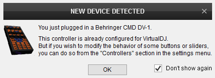 A detection window will appear when the unit is first connected with VirtualDJ, verifying proper connection