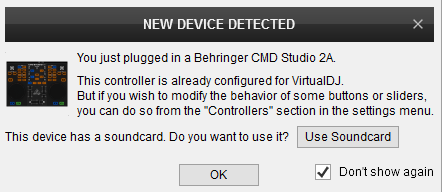 A detection window will appear when the unit is first connected with VirtualDJ, verifying proper connection