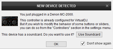 A detection window will appear when the unit is first connected with VirtualDJ, verifying proper connection