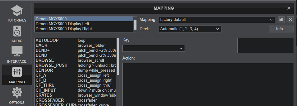 The unit should be visible in the MAPPING tab of Config as 3 devices (Denon DJ MCX8000 for the main unit and 2 more for the Left and Right LCD Displays) and the “factory default” available/selected from the Mappings drop-down list for all 3 of them.