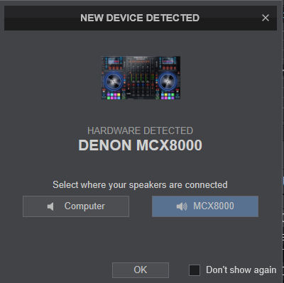 Click on the MCX8000 button in order VirtualDJ to apply the pre-defined audio configuration (speakers need to be connected to the rear side of the unit in this case)