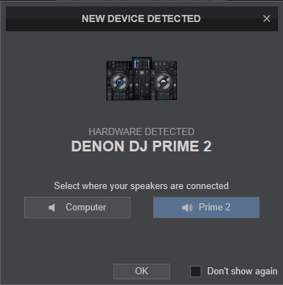 Select the Prime 2 button in order VirtualDJ to apply the pre-defined audio configuration (speakers need to be connected to the rear side of the unit in this case), or Computer if you don't have any speakers to connect to the Prime 4 and need to output sound from the default sound card of your computer.