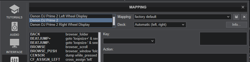The unit should be visible in the MAPPING tab of VirtualDJ Settings as 3 devices (Denon DJ Prime 2 for the main unit and 2 more for the Left and Right LCD Displays) and the “factory default” available/selected from the Mappings drop-down list for all 3 of them.