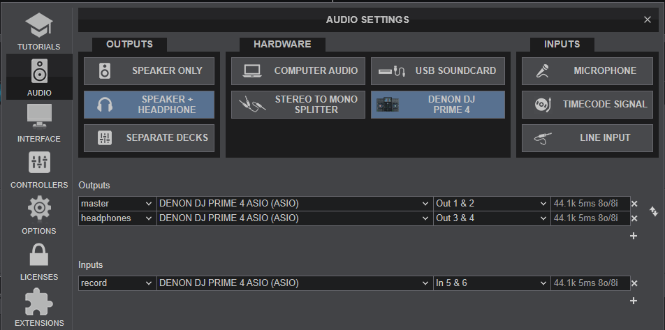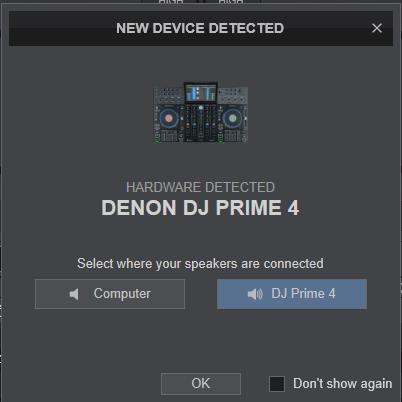 Select the DJ Prime 4 button in order VirtualDJ to apply the pre-defined audio configuration (speakers need to be connected to the rear side of the unit in this case), or Computer if you don't have any speakers to connect to the Prime 4 and need to output sound from the default sound card of your computer.