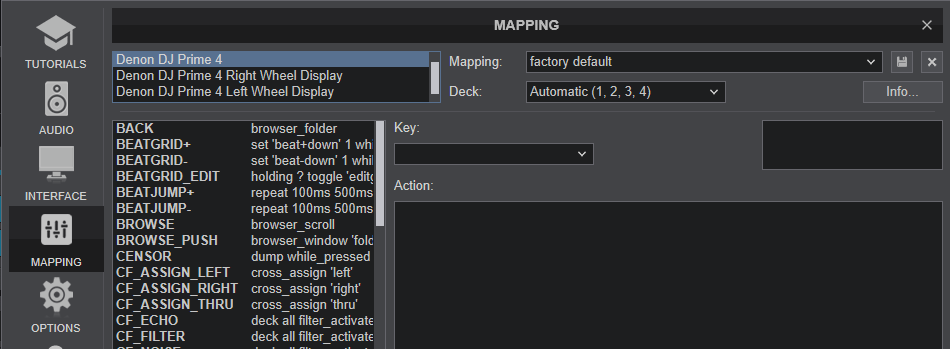 The unit should be visible in the MAPPING tab of VirtualDJ Settings as 3 devices (Denon DJ Prime 4 for the main unit and 2 more for the Left and Right LCD Displays) and the “factory default” available/selected from the Mappings drop-down list for all 3 of them.