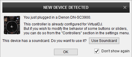 A detection window will appear when the unit is first connected with VirtualDJ, verifying proper connection