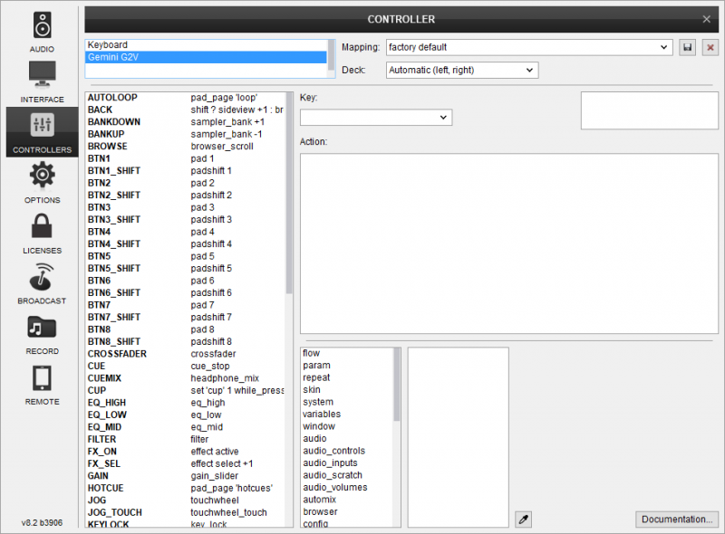 The unit should be visible in the CONTROLLERS tab of Config and the “factory default” available/selected from the Mappings drop-down list. The factory default Mapping offers the functions described in this Manual, however those can be adjusted to your needs via VDJ Script actions.