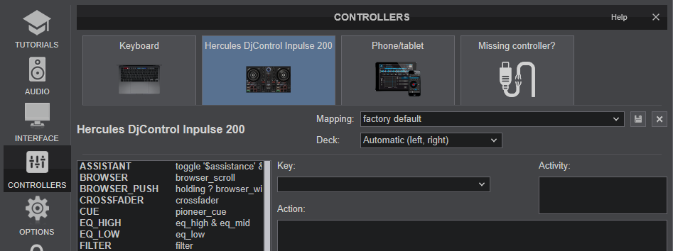 The device should be visible in the CONTROLLER tab of Config and the “factory default” available/selected from the Mappings drop-down list. The factory default Mapping offers the functions described in this Manual, however those can be adjusted to your needs via VDJ Script actions.