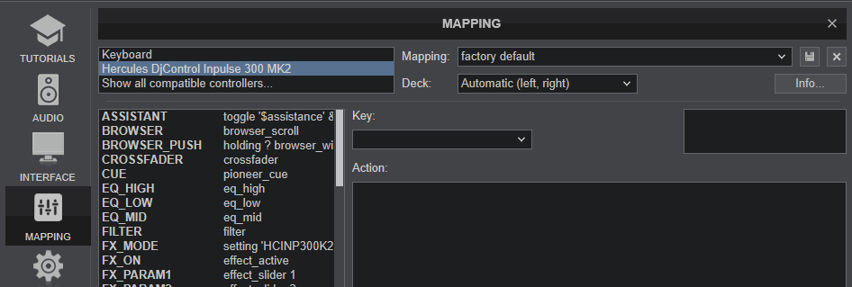 The device should be visible in the MAPPING tab of VirtualDJ Settings and the “factory default” available/selected from the Mappings drop-down list. The factory default Mapping offers the functions described in this Manual, however those can be adjusted to your needs via VDJ Script actions.