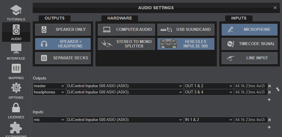 Click on the DJ Control Inpulse 500 button to allow VirtualDJ to auto-create the pre-defined audio configuration. Speakers need to be connected to the rear panel of the device.