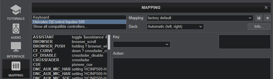 The unit should be visible in the MAPPING tab of Config and the “factory default” available/selected from the Mappings drop-down list. The factory default Mapping offers the functions described in this Manual, however those can be adjusted to your needs via VDJ Script actions.