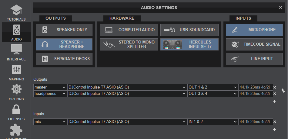Click on the DJControl Inpulse T7 button to allow VirtualDJ to auto-create the pre-defined audio configuration.