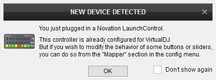 A detection window will appear when the unit is first connected with VirtualDJ, verifying proper connection.