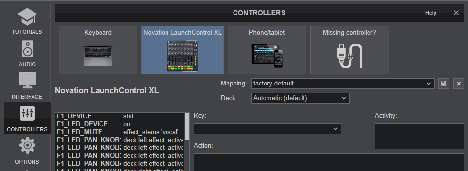 The device should be visible in the CONTROLLERS tab of Config and the “factory default” available/selected from the Mappings drop-down list.