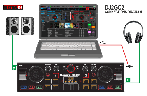 Connect the unit’s USB socket with a USB port of your computer using the provided cable. Connect a pair of amplified speakers or amplifier to the Master Output at the left side panel and a pair of headphones to the left side panel of the DJ2GO2