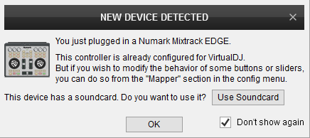 A detection window will appear when the unit is first connected with VirtualDJ.