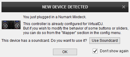 A detection window will appear when the unit is first connected with VirtualDJ.