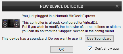 A detection window will appear when the unit is first connected with VirtualDJ.