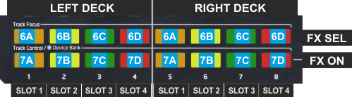 6ASelect the next available Effect in Slot 1Select the previous available Effect in Slot 16BSelect the next available Effect in Slot 2Select the previous available Effect in Slot 26CSelect the next available Effect in Slot 3Select the previous available Effect in Slot 36DSelect the next available Effect in Slot 4Select the previous available Effect in Slot 47AEnable the selected Effect in Slot 1Open the FX GUI of the selected Effect in Slot 17BEnable the selected Effect in Slot 2Open the FX GUI of the selected Effect in Slot 27CEnable the selected Effect in Slot 3Open the FX GUI of the selected Effect in Slot 37DEnable the selected Effect in Slot 4Open the FX GUI of the selected Effect in Slot 4Note : It is advised to use the 6 FX Layout for Effects on the VirtualDJ GUI to have a visual of Slots 1 to 4. For FX Params further to 1 for these Slots, open/close the FX GUI (using SHIFT+Track Control buttons) will offer a visual for them.
