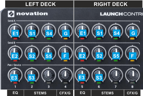 E1Adjust the High Frequencies of the VDJ Equalizer.E2Adjust the Mid Frequencies of the VDJ Equalizer.E3Adjust the Low Frequencies of the VDJ Equalizer.S1Adjust the HiHat StemS2Adjust the Vocal StemS3Adjust the Instrument StemS4Adjust the Bass StemS5Adjust the Kick StemGAdjust the Gain (pre-fader level) FAdjust the selected Color FX (Filter by default)FADERS - VOLUMES