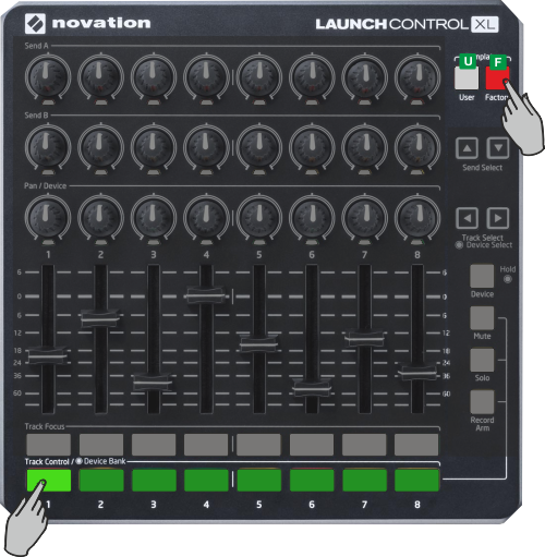 Hold the FACTORY Template button down and then press one of the 8 Track Control buttons to select Factory Template 1 to 8.